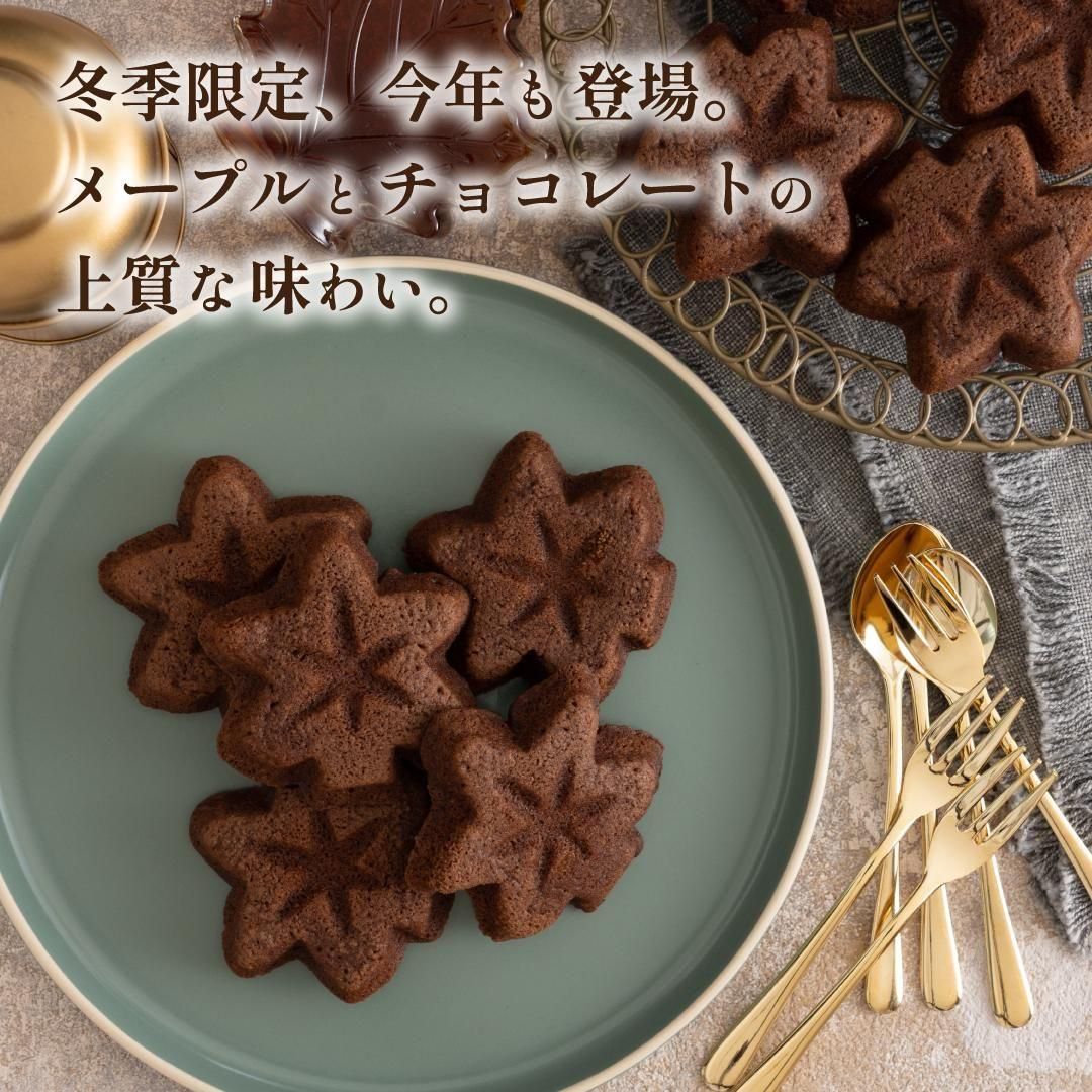 期間限定販売 “メープルもみじフィナンシェプレミアムショコラ” しっとりとした食感、メープルとチョコレートを掛け合わせる事で、 上質な味わいに仕上げています。 厳選された原材料 楓乃樹スイーツは、深いコクと芳醇な風味にこだわり、メープルはもちろんひとつひとつの原材料も厳選したもののみを使用しています。 カナダ・ケベック州産のメープルを100%使用 楓乃樹メープルシリーズは、メープルシロップの名産国として有名な カナダ・ケベック州産のメープルを100%使用しているので、お子様でも安心してお召し上がり頂けます。 メープルとチョコの香り豊かなスイーツ メープルもみじフィナンシェをベースにココアパウダー、クーベルチュールチョコレートを加える事により、 メープルとチョコレートのハーモニーをお楽しみ頂けます。 期間限定販売、冬季のみのお楽しみとなっておりますので、お早目におためし下さいませ。
